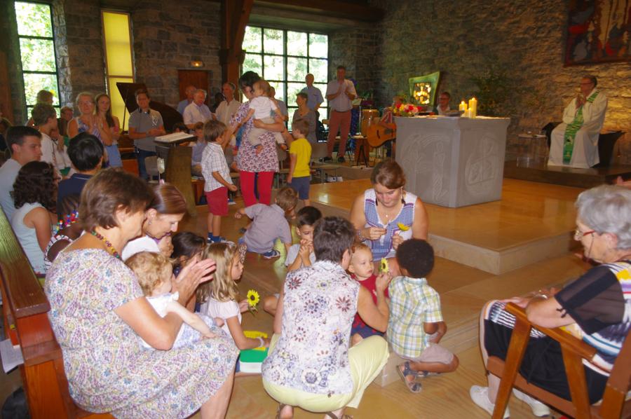 Una acogida de familias acompañadas por los más “pequeños” (entre 1 y 5años ½) está propuesta durante un retiro de verano. Unas amigas de la comunidad asumen esta acogida para permitir a los padres participar plenamente del retiro.